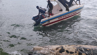 Sabtu (30/01/2021) tim patroli Smart Resort Bunaken di hari jumat, 29 Januari 2021 pada pukul 17.00 wita, melakukan pemantauan aktifitas pengunjung, saat melintas perairan mencium bau menyengat seperti bangkai dan ketika didekati tim melihat ada bangkai Paus di Perairan Pantai Liang Bunaken.